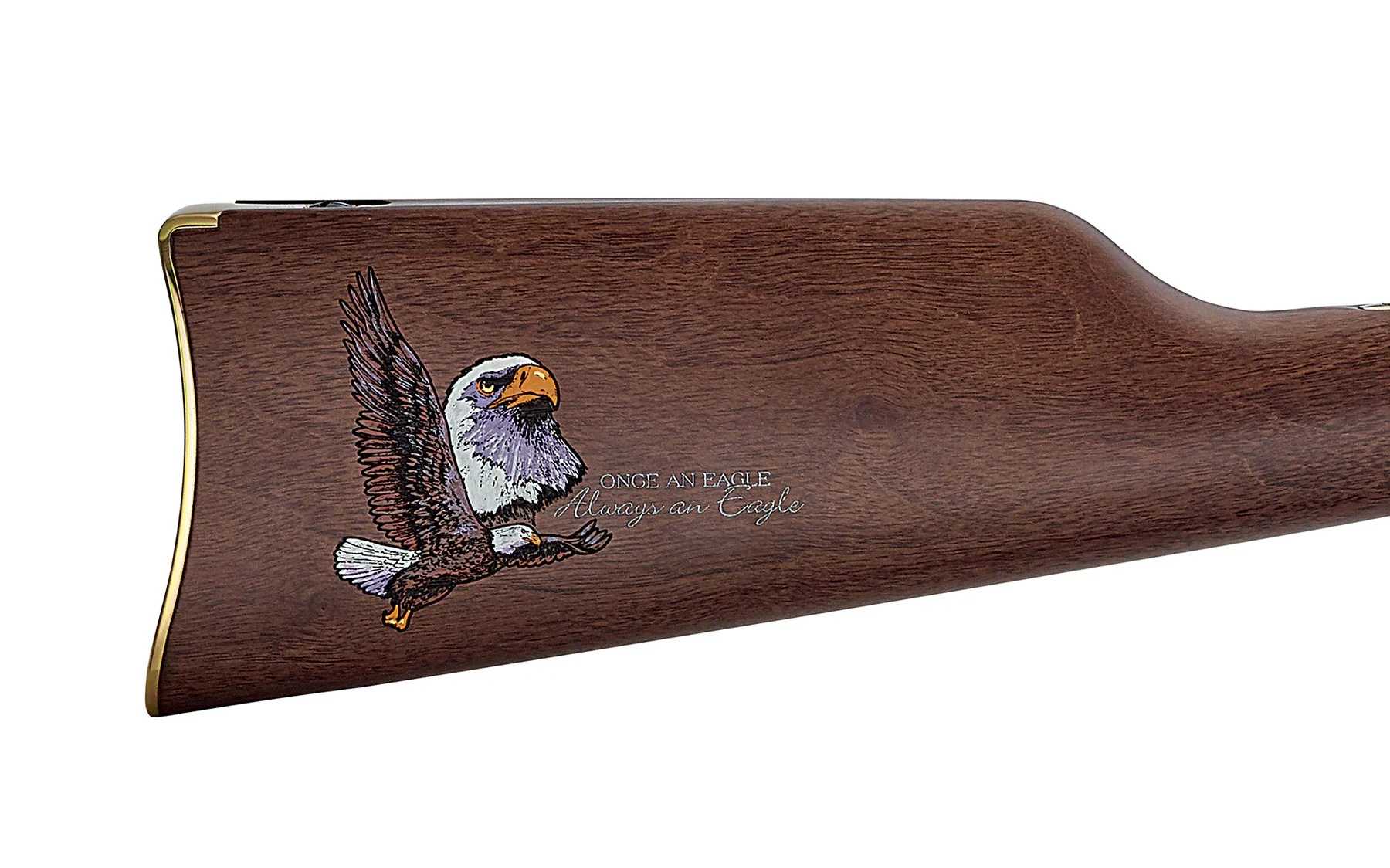 The genuine American walnut stocks elevate the rifle further, featuring intricately engraved designs hand-painted in full color. On the buttstock, a portrait of a bald eagle’s head appears above one of America’s most enduring symbols: a bald eagle soaring in full flight. Completing the design is the timeless phrase, “Once an Eagle, Always an Eagle.” The forearm showcases historic variations of the Eagle Scout badge, culminating in the Centennial version introduced in 2012 to mark 100 years of the Eagle Scout rank.