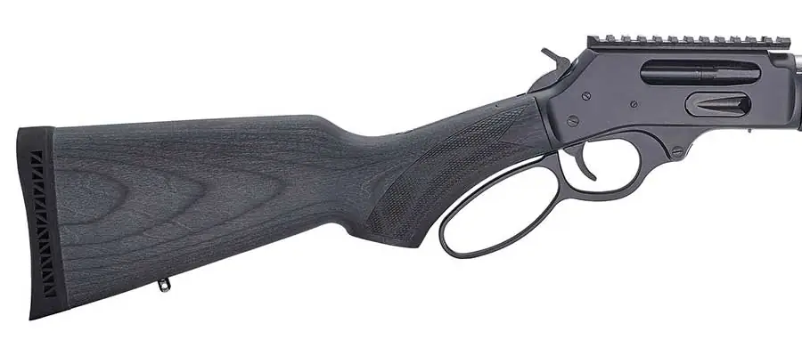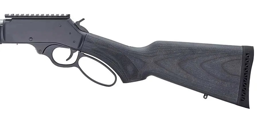 The matte dark gray American hardwood laminate buttstock conceals more than meets the eye. It’s hollowed out just enough to remove some weight while retaining exceptional durability, and the checkering and rubber recoil pad provide increased purchase and comfort. Opting for the laminate buttstock ensures the familiar wood-to-skin touch that’s missing from full aluminum builds. Additional visual and functional enhancements—like a matte-finished outer magazine tube, lever, and trigger—round out the series with thoughtful finishing touches. After all, we have to make it look good too.