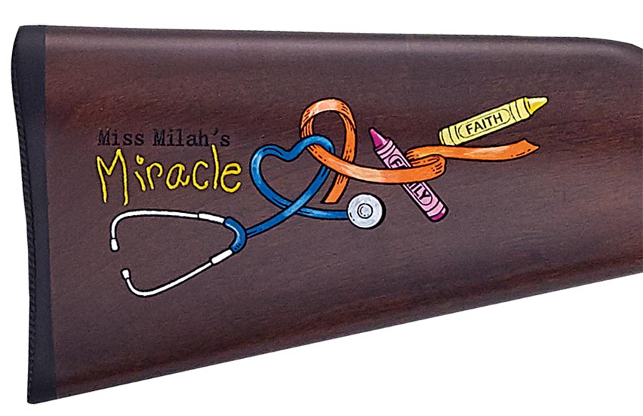 The Henry “Miss Milah’s Miracle” .22 S/L/LR lever action rifle features genuine American walnut stocks with a colorful hand painted motif that incorporates elements of Milah’s personality. A doctor’s stethoscope, referring to Milah’s adulthood ambitions, forms a heart shape and becomes intertwined with a bright orange ribbon that represents kidney cancer. Two crayons symbolize Milah’s love of coloring and the labels bearing the words “Faith” and “Family” serve as tributes to what helps the Schevenius family through their journey. The rifles are fitted with a brushed silver receiver cover and barrel band, a 17” blued steel octagon barrel, adjustable sights, and a large loop lever.