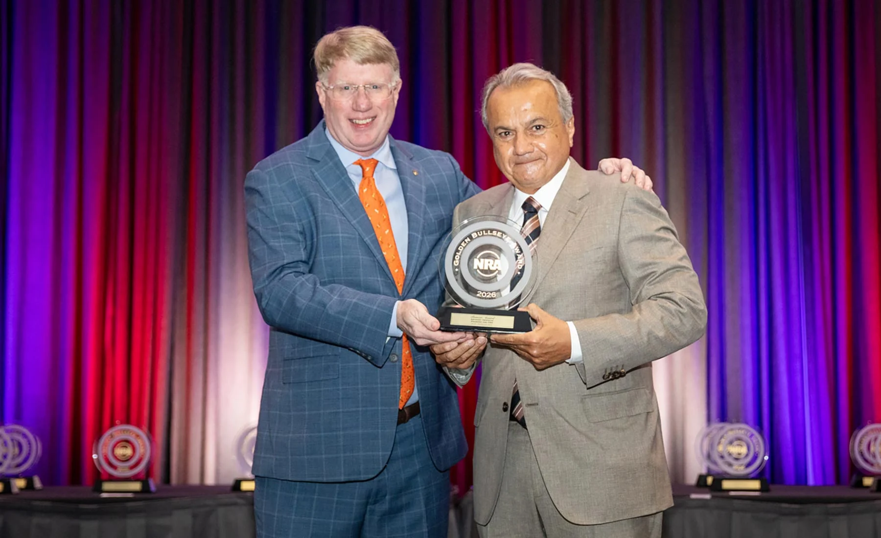 Anthony Imperato, Founder and CEO of Henry Repeating Arms, receives the 2026 Golden Bullseye Pioneer Award from Mark Keefe, Editorial and Public Affairs Director, during the National Rifle Association Annual Meetings & Exhibits in Houston, Texas, on Friday, April 17, 2026. The award recognizes Imperato’s enduring contributions to the firearms industry, American manufacturing, and the shooting sports.