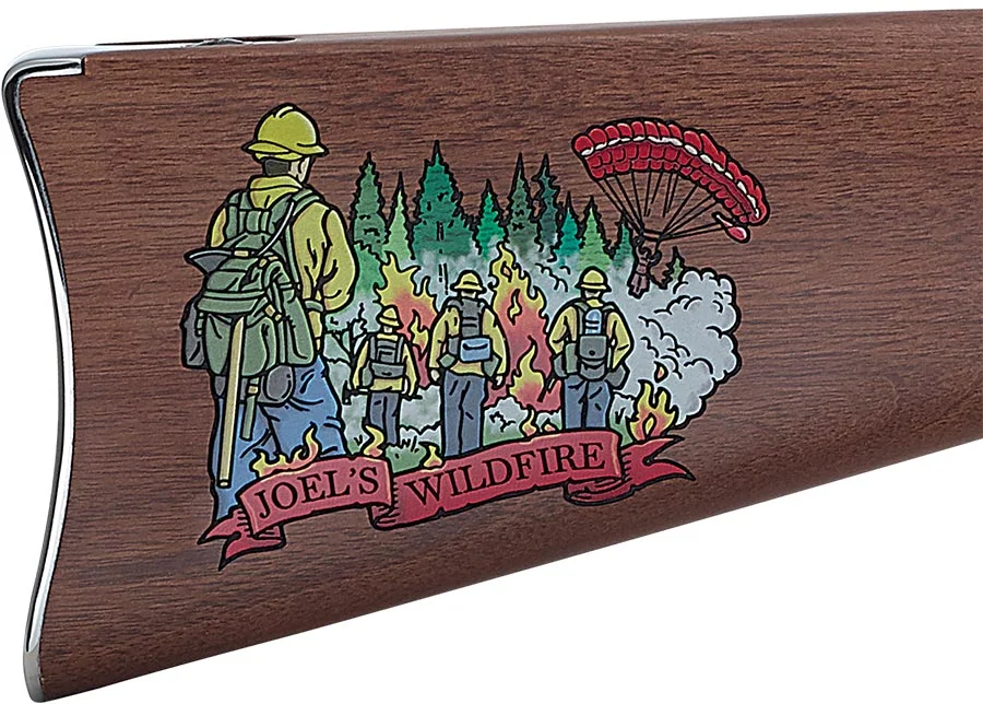 Each rifle in the series features a custom-engraved and painted American walnut buttstock depicting a group of wildfire firefighters, Joel’s brothers on the fireline, walking together toward the flames above a banner reading “Joel’s Wildfire.” Other features include a polished blued steel octagon barrel, nickel-plated receiver cover, barrel band, and buttplate, adjustable sights, and a custom range of serial numbers from WILDFIRE01 through WILDFIRE50. Capacity is 16 rounds of .22 LR or 21 rounds of .22 Short.