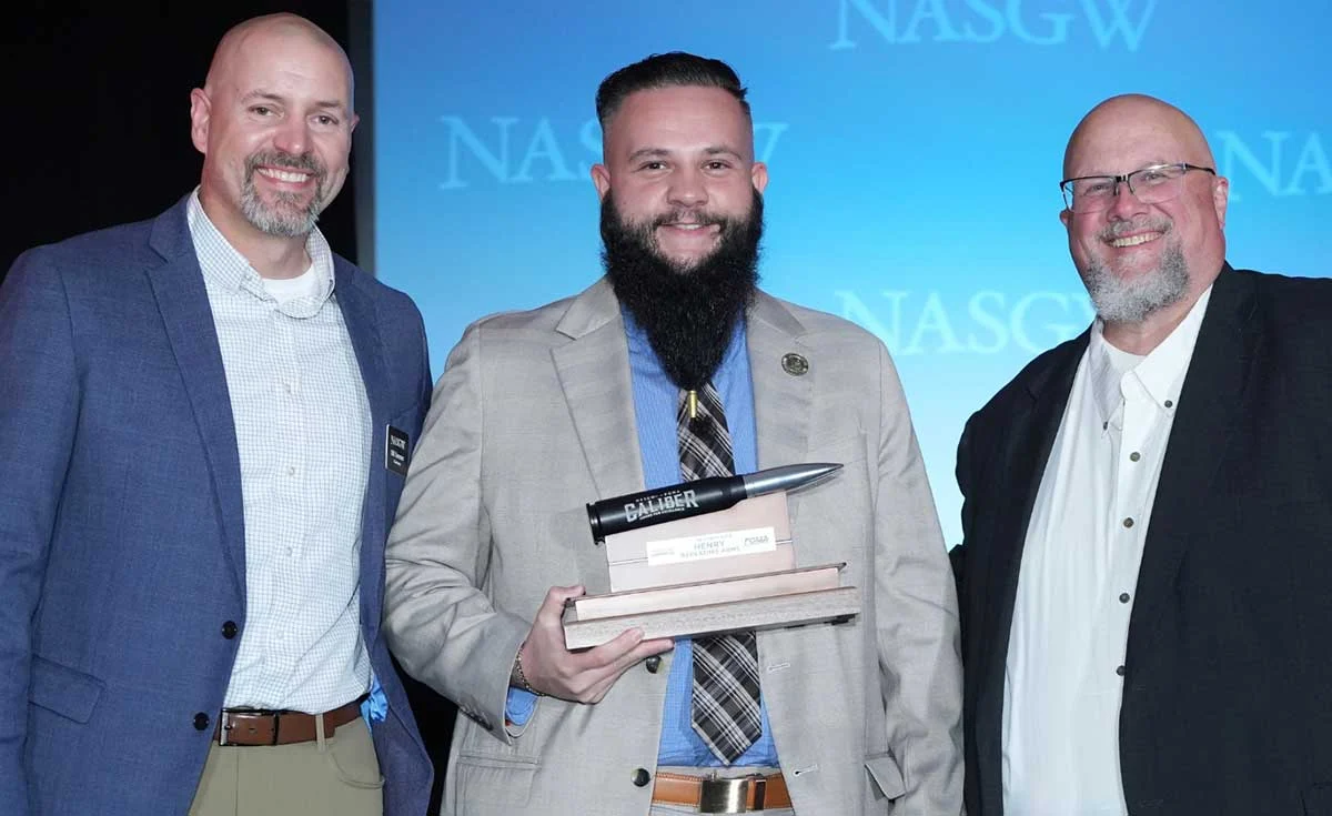 NASGW Chairman Bill Sumner (left) and POMA Executive Director Rob Sexton (right) present the Best New Rifle Caliber Award to Henry Repeating Arms’ Nicholas DeAngelo for the SPD HUSH Series. (Photo: NASGW)